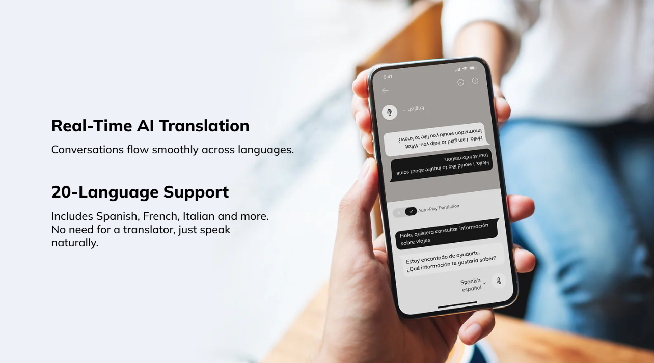 Need to communicate in another language? Our AI-powered real-time translation instantly translates 11 languages, making travel, socializing, and family conversations a breeze!